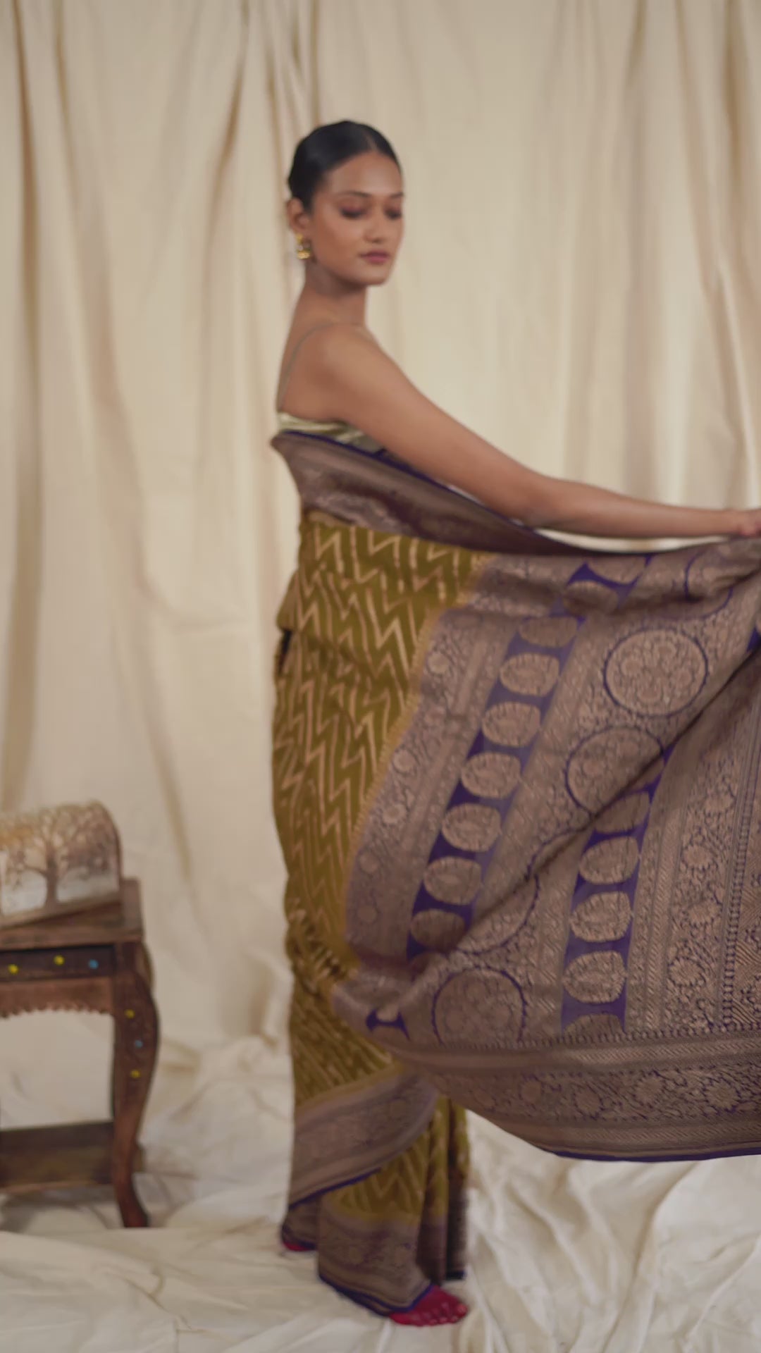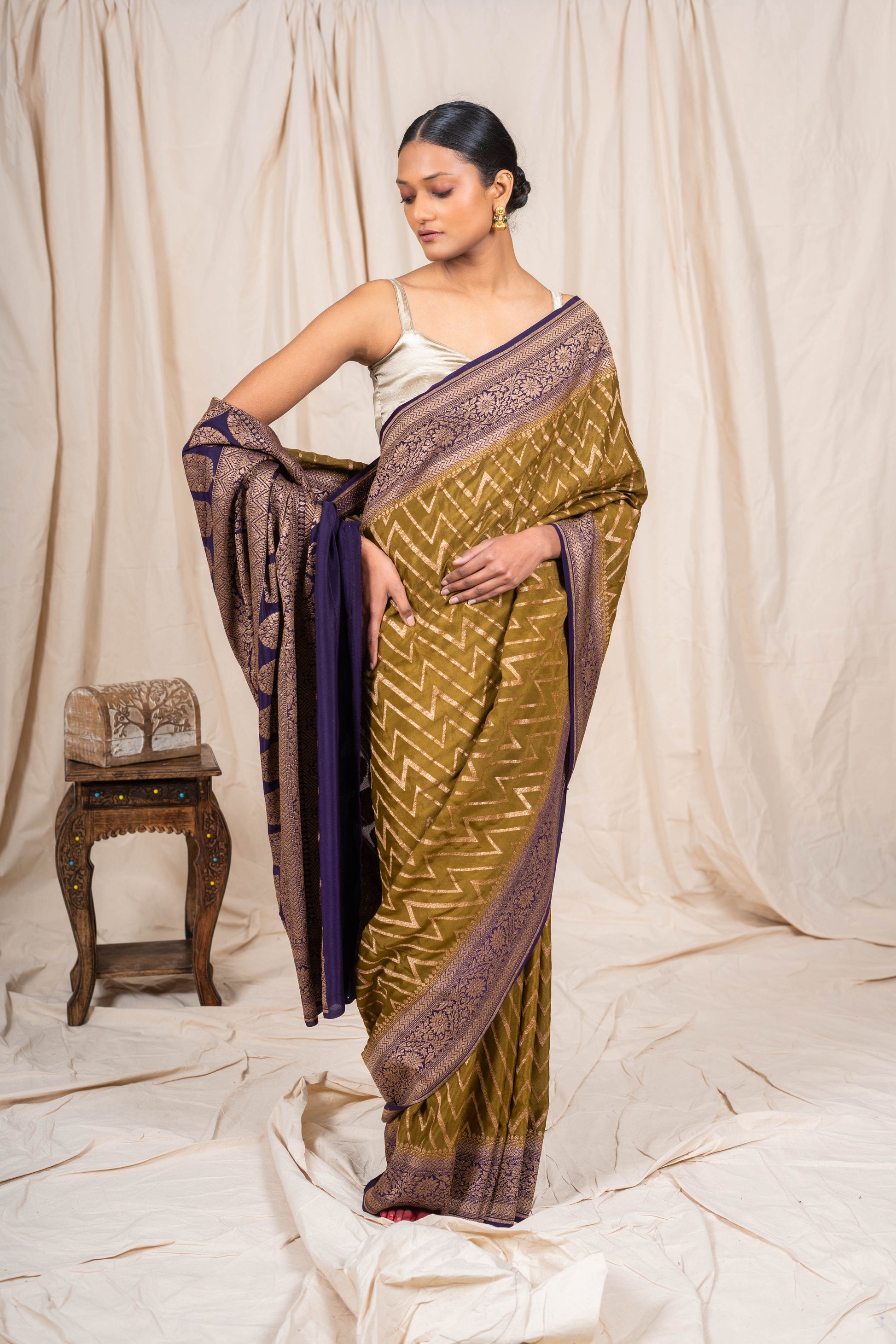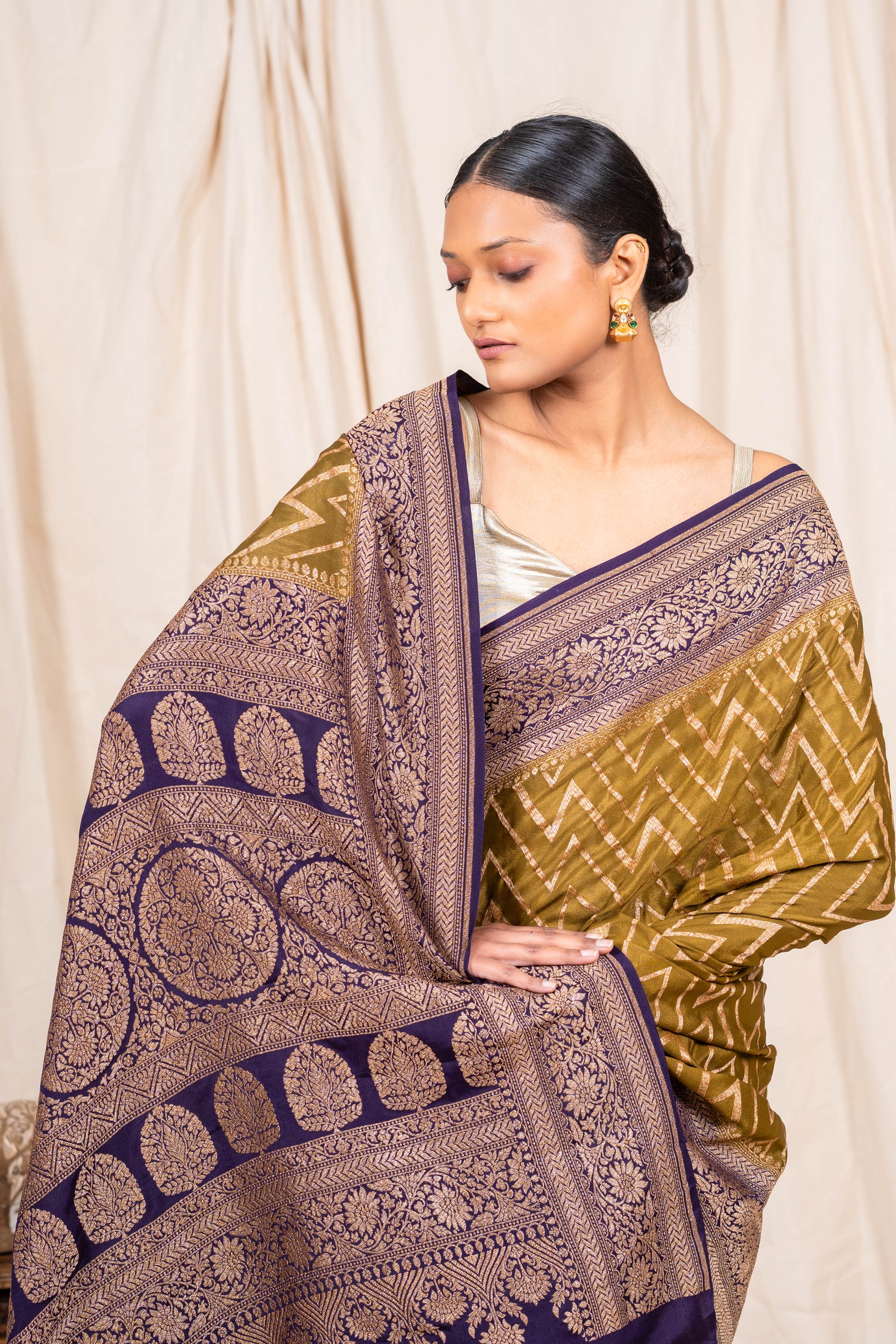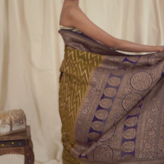 The Dhani Green Crepe Silk Banarasee Saree isn’t just about colour—it’s about carrying freshness, grace, and history, all in one fluid drape.