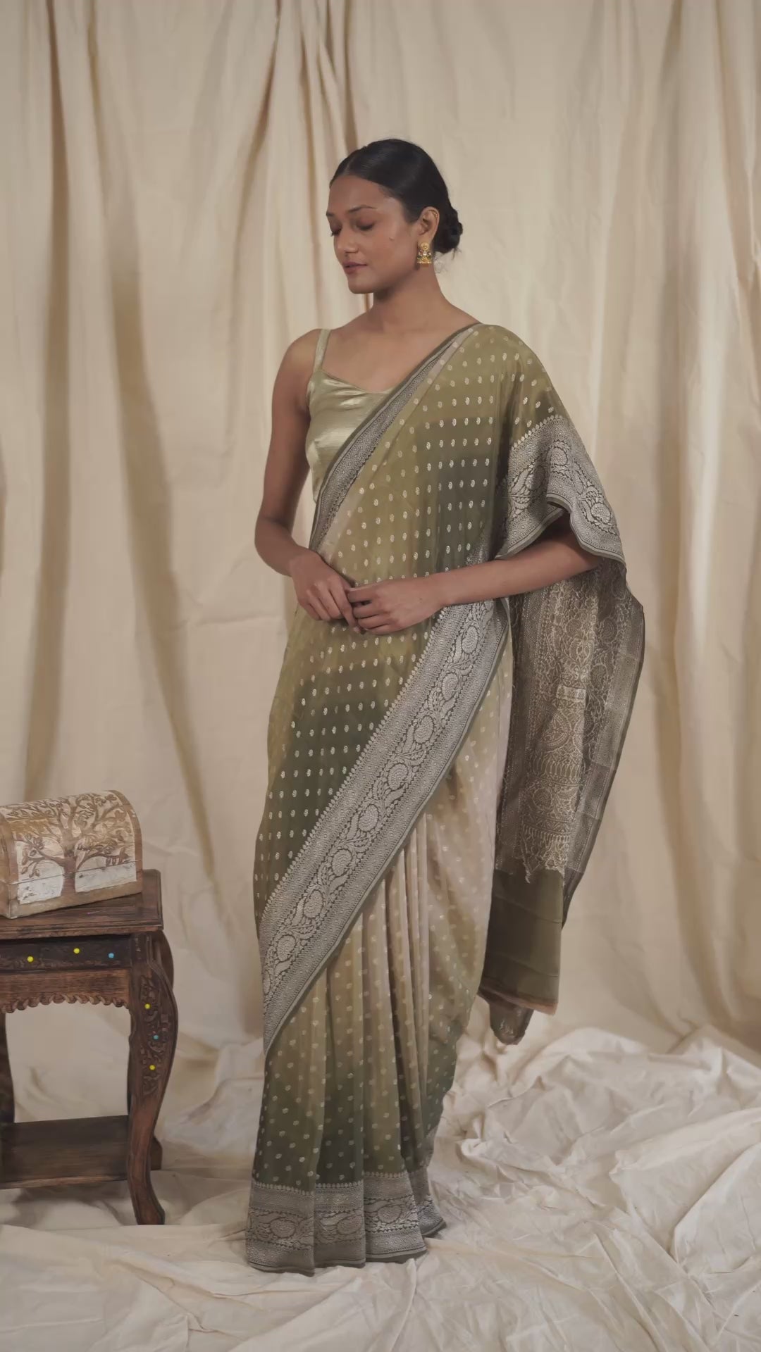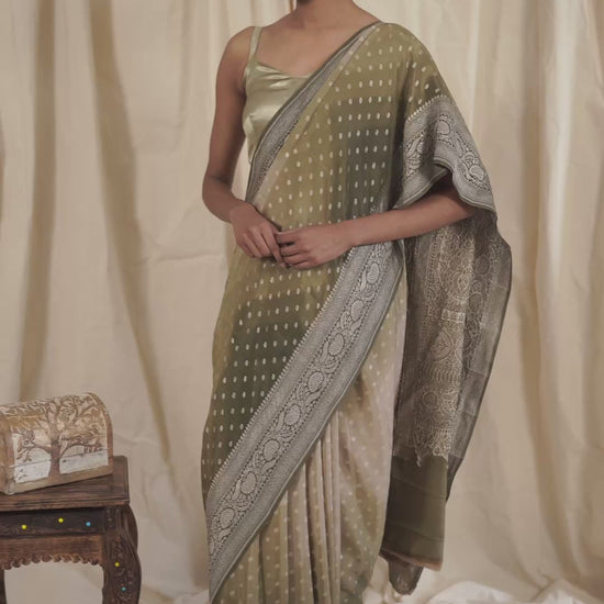 Refined Banarasi Zari Details – Intricate yet minimalistic zari patterns elevate the saree subtly, adding that delicate shimmer without taking away from its calm character.