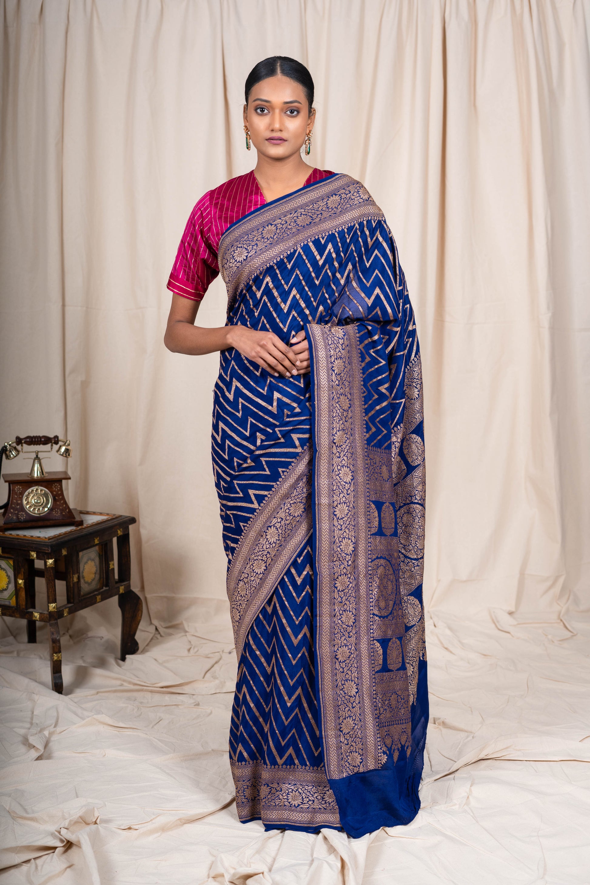 Elevate your ethnic wardrobe with this navy blue Banarasi saree—where tradition meets elegance in every thread.
