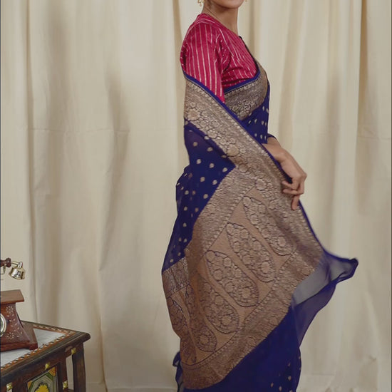 Navy Blue Khaddi Georgette Handwoven Banaras Saree