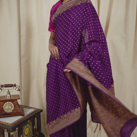 Graceful, fluid, and rich in heritage—this Wine Crepe Silk Banarasi Saree is for the woman who carries tradition with a touch of ease. Its deep wine hue, paired with the buttery drape of crepe silk, creates a timeless silhouette that’s as luxurious as it is wearable.